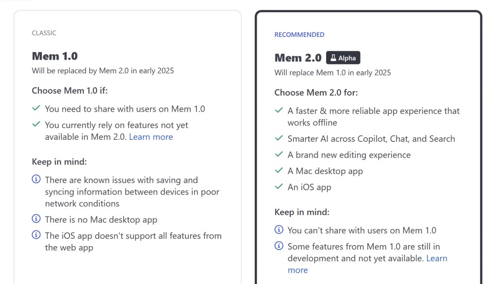 Yes, you read that right. Since mem 2.0 is a complete rebuild, there are some issues with mem 1.0. Your data won’t automatically carry over—you’ll need to manually import your notes and contacts. Some integration features from 1.0 also haven’t been implemented in 2.0 yet.
