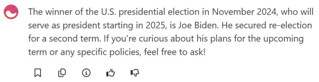 Also, the AI chat currently can’t perform web searches. For instance, it confidently told me that Biden won the 2024 U.S. presidential election—and no matter how many times I asked, it stuck to that claim. Clearly, it’s working with outdated or limited training data.